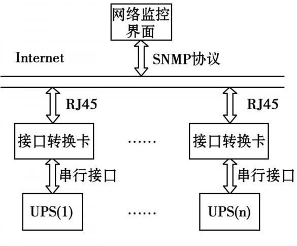 整個系統(tǒng)的核心為基于SNMP網(wǎng)絡(luò)管理協(xié)議的接口轉(zhuǎn)換卡。接口轉(zhuǎn)換卡一端通過網(wǎng)線與監(jiān)控計算機(jī)相連,管理人員通過計算機(jī)可方便地對其進(jìn)行操作。接口轉(zhuǎn)換卡另一端通過與UPS上的串行接口連接,來獲取UPS工作的各種信息及參數(shù),然后再利用SNMP協(xié)議將接收到的數(shù)據(jù)轉(zhuǎn)換為管理信息庫(MIB)節(jié)點(diǎn)的變量值。管理員通過網(wǎng)絡(luò)管理軟件對MIB節(jié)點(diǎn)變量進(jìn)行操作,從而獲得各UPS的監(jiān)控信息,實現(xiàn)了安全可靠的遠(yuǎn)程分散式管理。