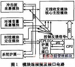 無線傳感器網(wǎng)絡(luò)是由大量傳感器節(jié)點(diǎn)通過無線通信自組織構(gòu)成的網(wǎng)絡(luò),被認(rèn)為是將對21世紀(jì)產(chǎn)生巨大影響力的技術(shù)之一。在分布式測試中使用無線傳感器網(wǎng)絡(luò),不受通信電纜的限制、組態(tài)靈活、重構(gòu)性強(qiáng),可以在較惡劣的測試環(huán)境中使用。由無線傳感器網(wǎng)絡(luò)組成的分布式測試系統(tǒng)已應(yīng)用于水中爆炸測試系統(tǒng)。在一些分布場測試系統(tǒng)中,被測量種類繁雜,為完成測試任務(wù),節(jié)點(diǎn)采用模塊化設(shè)計(jì),SPI接口電路簡單、傳輸速度快,各模塊通過SPI總線通信協(xié)同完成測試任務(wù)。但在實(shí)際開發(fā)應(yīng)用中,由于系統(tǒng)要求,使某些模塊與多個(gè)模塊鏈接,且接口工作在不同的模式下,如果完成通信需要功能模塊的SPI接口主從切換,致使通信速度與靈活性降低。CPLD具有可編程性特點(diǎn),可根據(jù)需要擴(kuò)展專用SPI接口電路,提高系統(tǒng)通信速度與靈活性,方便系統(tǒng)擴(kuò)展功能模塊,提高系統(tǒng)整體性能。