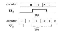 對從模式(MSTR=0),在沒有數(shù)據(jù)傳送的時候,SS高電平表示從器件未被選中,從器件不工作,MISO輸出高阻;在數(shù)據(jù)傳輸過程中,片選信號SS必須接低電平,且SS不允許跳變。如果SS從低電平跳到高電平,在SS的上跳沿,SPI模塊也將檢測到模式錯誤,清空內(nèi)部計數(shù)器counter,并結(jié)束正在進行的數(shù)據(jù)傳輸。直到SS恢復(fù)為低電平,重新使SPEN=1時,才重新開始工作,如圖6(b)所示。