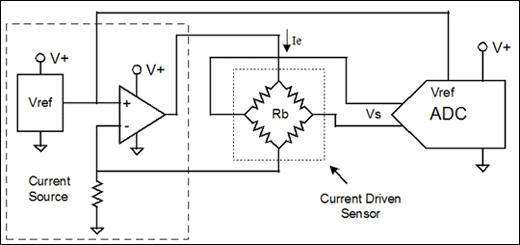 圖4. 該設(shè)計(jì)中電流驅(qū)動(dòng)傳感器的電流源由一個(gè)電阻,一個(gè)運(yùn)算放大器和一個(gè)電壓基準(zhǔn)組成。