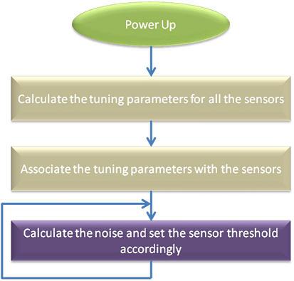 噪聲是一個(gè)隨機(jī)時(shí)間函數(shù),由其自身性質(zhì)決定。工作一個(gè)小時(shí)后和剛開機(jī)時(shí)是不一樣的,下一個(gè)時(shí)刻又不相同。因此,手指檢測(cè)的閾值應(yīng)基于傳感器原始計(jì)數(shù)檢測(cè)到的噪聲來調(diào)整。圖8顯示了自調(diào)試系統(tǒng)如何基于系統(tǒng)噪聲調(diào)整手指閾值。