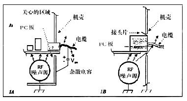 即使工程師采取許多上述所列的預防措施,來減小在I/O區(qū)內的RF噪聲,還不能保證這些預防措施能否成功地足夠滿足發(fā)射要求。有些噪聲是傳導干擾,即在內部電路板上按共模電流流動。這個干擾源是在底板和電路等之間。于是,這個RF電流一定通過最低阻抗(在底板和載信號線之間)的通路流動。如果連接器沒呈現(xiàn)足夠低的阻抗(與底板的搭接處),這RF電流經雜散電容流動。當這RF電流流過電纜時,不可避免地產生發(fā)射(圖1A)。