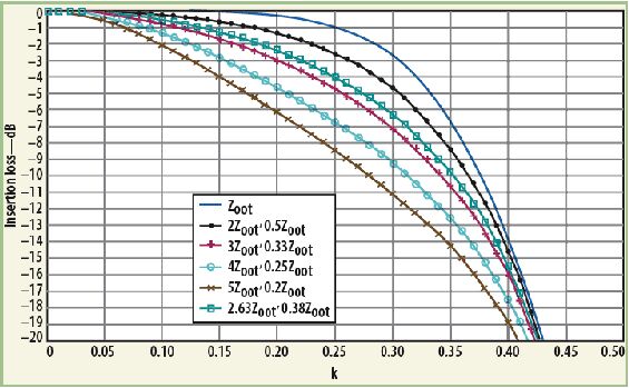 圖4中,對(duì)于優(yōu)化和非優(yōu)化的特性阻抗值,都把插損看作k的函數(shù)。相比采用了優(yōu)化特性阻抗的情況,特性阻抗非優(yōu)化時(shí),插損增加,帶寬減小。于是,使用絞合傳輸線(xiàn)很容易獲得最佳特性阻抗值。