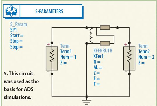 為了對(duì)變壓器響應(yīng)進(jìn)行散射參數(shù)(S參數(shù))仿真,ADS采用它的S_Param建模器,按照規(guī)定的步長(zhǎng)和刻度步長(zhǎng)調(diào)節(jié)初始(開(kāi)始)的和最終(停止)的掃頻頻率。源和負(fù)載阻抗由一個(gè)阻抗值為Z的、被稱(chēng)為T(mén)erm的特殊終端表示。圖5所示為ADS仿真中所用的電路。