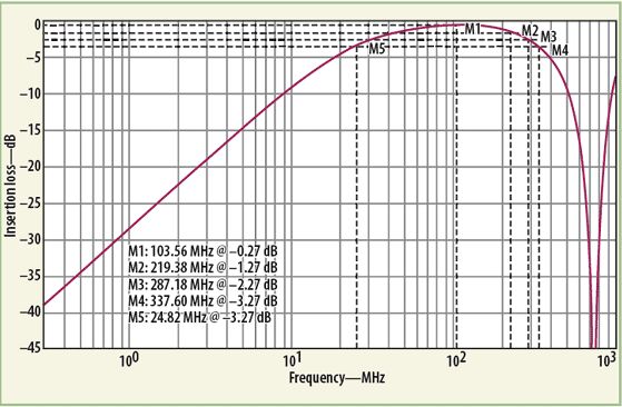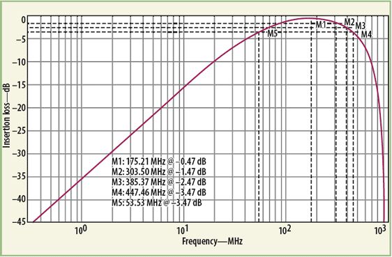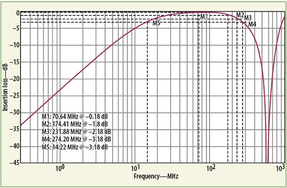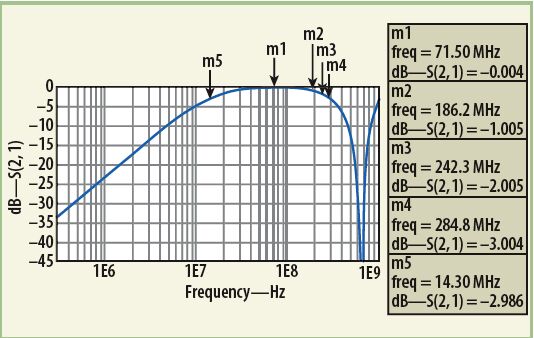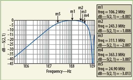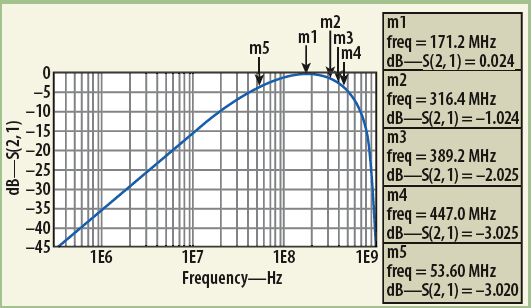 MathWorks的MATLAB數(shù)學(xué)分析軟件曾被用來(lái)分析這種變壓器器件模型的響應(yīng)。分析中,把單獨(dú)的低頻(公式1)響應(yīng)和高頻(公式5)響應(yīng)的插損響應(yīng)結(jié)合在了一起。將所需的目標(biāo)值代入MATLAB公式,可獲得寬帶變壓器的最終響應(yīng)。為了執(zhí)行MATLAB模型數(shù)值響應(yīng)的電氣仿真,使用了ADS建模軟件。該軟件有一個(gè)很有用的內(nèi)部源模型,稱(chēng)為XFERRUTH,其變量參數(shù)包括匝數(shù)(N)、電感因子(AL)、傳輸線(xiàn)特性阻抗(Z)、傳輸線(xiàn)電氣長(zhǎng)度(E),以及計(jì)算傳輸線(xiàn)長(zhǎng)度所需要的參考頻率(F)。