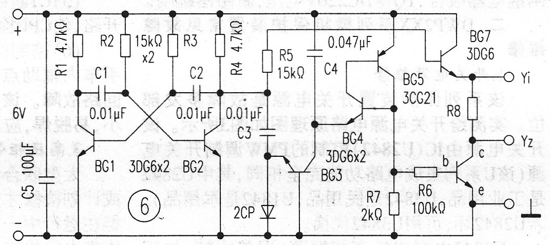 電路圖中的BG1、BG2、R1~R4、C1、C2等組成多諧振蕩器,BG3~BG5、C3、C4等組成階梯波發(fā)生器,詳細(xì)工作原理讀者可自行分析,這里就不一一贅述了。