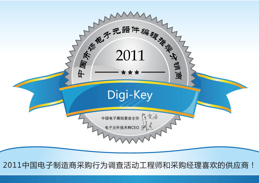 在近日剛剛結束的2011中國電子制造商采購行為調查暨中國市場電子元器件領軍廠商的評選活動中,Digi-key憑借廣泛的電子元器件庫存、最全面的在線資源和快速響應客戶訂單等多方面優(yōu)勢,以及在工程師心目中形成的良好形象,一舉榮獲2011中國市場電子元器件編輯推薦分銷商稱號!
