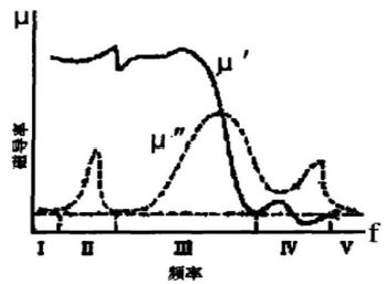 圖 3 是磁導率的頻散特性曲線,它可分為Ⅰ-Ⅴ個區(qū)域來分析??梢?,在一定的頻率范圍內 μ'''' 值(在某一磁場下的磁導率)保持不變,然后隨頻率的升高磁導率 μ'''' 有一最大值。頻率再增加時,μ'''' 迅速下降。代表材料損耗的虛數(shù)磁導率 μ" 在低頻時數(shù)值較小,隨著頻率增加,材料的損耗(即μ")增加。