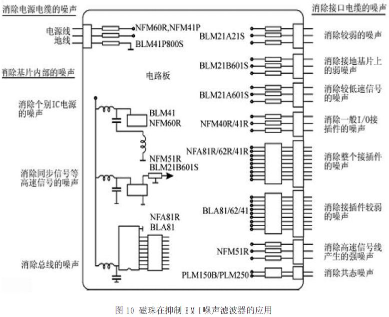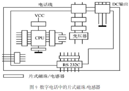 圖8、圖9、圖10 分別示出了磁珠在直流供電回路、數(shù)字電話、抑制 EMI 噪聲濾波器中的應用實例。
