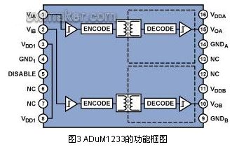 ADI公司的隔離門(mén)級(jí)驅(qū)動(dòng)器系列產(chǎn)品采用iCoupler技術(shù),其中雙通道 ADuM1233(圖3)提供了輸出通道和輸入通道之間的隔離以及兩個(gè)輸出通道之間的隔離,適用于IGBT控制通道的隔離。