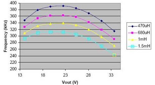 下圖給出了頻率根據(jù)不同的輸出電壓和不同的電感值的變化曲線。