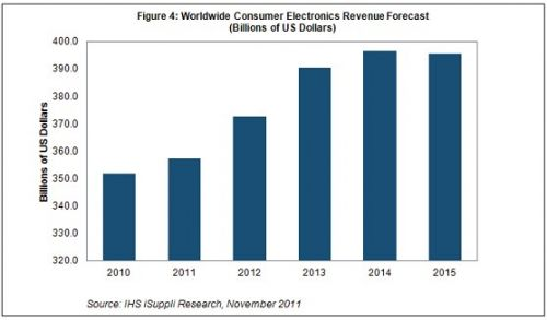 2011年消費電子營業(yè)收入增長率較低,與2010年相比明顯放緩。去年該市場增長7.9%。但是,未來兩年消費電子營業(yè)收入將恢復適度增長,隨后在2014年放緩,2015年持平,屆時總體消費電子營業(yè)收入將接近4000億美元,如圖4所示。