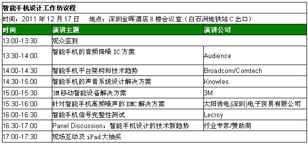 HTC、SAMSUNG、LG、SHARP、AT&T、SK Telecom、PANTECH、DoCoMo 等手機設計領軍廠商在智能市場領域的競爭非常激烈,他們都用到哪些技術?由我愛方案網(wǎng)(www.52solution.com)、電子元件技術網(wǎng)(www.hubali.cn)和China Outlook Consulting主辦的首屆智能手機設計工作坊(Smart Phone Design Workshop)將于2011年12月17日下午在深圳金暉酒店8樓會議室隆重召開!為您Hold 住 2012 智能趨勢,給力手機開發(fā)設計!