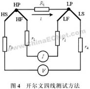 當被測電阻阻值小于幾歐,測試引線的電阻和探針與測試點的接觸電阻與被測電阻相比已不能忽略不計時,若仍采用兩線測試方法必將導致測試誤差增大。此時可采用開爾文連接方式(或稱四線測試方式)來進行測試,如圖4。