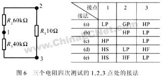 在這種情況下可以采用一種變形的開爾文連接方式來進行測試,不再使用隔離方法。它仍采用四根線,但根據(jù)需要將其中一對或兩對F,S線分開接在不同的點上來進行測試。這種方式稱為分離開爾文連接方式。本例中三個電阻要進行四次測試才能計算出它們的阻值,四次測試的接法分別見圖6中的表,圖中1,2,3點為連接點。圖6-(b) 接法可直接測出R1的值;圖6-(c)可測出 R2與R3的并聯(lián)值R p;圖6-(d)和圖6-(e)分別測出阻值R2 ′和R3′。分析可知:
