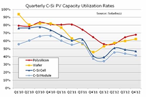 而對于一些第三季度還曾開足馬力生產(chǎn)的上游廠商來說,終端安裝量的激增并沒有全部轉(zhuǎn)化為新增訂單,出貨受阻導(dǎo)致三季度末庫存周轉(zhuǎn)天數(shù)不減反增,因此在第四季度堅決調(diào)低了產(chǎn)能利用率。晶硅電池和組件制造環(huán)節(jié)在第四季度的平均產(chǎn)能利用率僅為四成左右,預(yù)計在2012年一季度還將維持在這一水平附近,二季度開始則會出現(xiàn)回升。