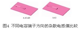 大功率器中分布雜散電感的抑制離不開(kāi)緩沖電容和電解電容,出于成本考慮,一般選用鋁電解電容支撐母線直流電壓,由于其耐壓等級(jí)低,需要大量串并聯(lián),連接線路上的雜散電感會(huì)造成各并聯(lián)電容間高頻電流分布不均勻,距離功率器件較近的電容會(huì)承受高于額定值的電流而急劇發(fā)熱,因此這兩者是工業(yè)工程應(yīng)用中的主要問(wèn)題。在電容結(jié)構(gòu)設(shè)計(jì)中,主要影響因素分別是:電容端子設(shè)計(jì)方向、電容串聯(lián)結(jié)構(gòu)設(shè)計(jì)。圖4分別測(cè)量了不同電容端子設(shè)計(jì)電感的值,圖5給出了典型設(shè)計(jì)方案和主流低電感設(shè)計(jì)方案中電容串聯(lián)方式的不同。從圖5中可以得出這樣的結(jié)論,電容端子的方向?qū)﹄姼杏休^大影響,而電容采用無(wú)環(huán)路串聯(lián)方式可以極大的降低母排電感。圖6給出了電容端子設(shè)計(jì)良好時(shí)母排電流的有限元分析,由圖6可以看出在母線排表面電流分布十分均勻,等效作用降低了電感。