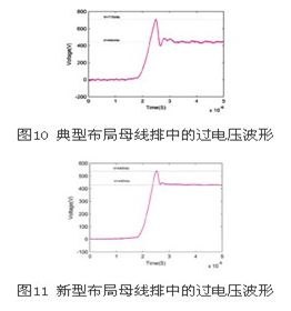 本節(jié)主要通過(guò)實(shí)驗(yàn)進(jìn)行典型布局下的母線排igbt過(guò)電壓波形與采用優(yōu)化后布局的比較,如圖9所示。實(shí)驗(yàn)使用80kva/400v變流器系統(tǒng)。圖10和圖11為實(shí)驗(yàn)得到的igbt過(guò)電壓波形,其中圖11為采用典型布局的h橋母線排中測(cè)得的igbt過(guò)電壓波形,圖11為采用優(yōu)化后布局的母線排中測(cè)得的igbt過(guò)電壓波形。由圖中可以看出新型母線排布局有良好的抑制過(guò)電壓效果。