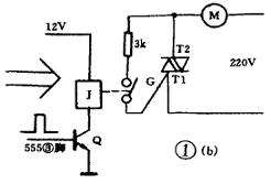 正確的方式見(jiàn)圖1b。可控硅與抽水電機(jī)組成抽水控制開(kāi)關(guān),SCR的觸發(fā)由T2與G間接入電阻控制。當(dāng)水位降低時(shí),控制觸點(diǎn)開(kāi)路,555第3腳輸出高電平(此電路部分省略),使Q導(dǎo)通,繼電器J吸合,SCR觸發(fā)導(dǎo)通,電機(jī)開(kāi)始運(yùn)轉(zhuǎn)。當(dāng)水位達(dá)到時(shí), 觸點(diǎn)經(jīng)水接通,555第3腳輸出低電平,Q截止,SCR在交流電過(guò)零時(shí)截止,抽水停止。