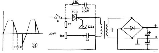 圖3是某電子雜志刊出的無(wú)級(jí)直流輸出調(diào)壓電路。原作者稱,利用Rc移相網(wǎng)路控制SCR的導(dǎo)通角改變變壓器初級(jí)的電流,從而獲得兩路連續(xù)可調(diào)的2x(0—17V) 的直流輸出電壓,負(fù)載電流為800mA 。很明顯,推薦電路(圖3)是普通移相式調(diào)功電路和降壓變壓器整流濾波電路的串聯(lián), 從基本原理分析,似乎無(wú)大的原則問(wèn)題。變壓器初級(jí)每半周電流有效值隨可控硅導(dǎo)通角變化,次級(jí)輸出電壓的峰值、平均電流值都隨之而變。當(dāng)然,一定負(fù)載時(shí)輸出整流電壓也必然改變。本人看后,極感興趣,依此原理制作了一臺(tái)輸出100±40V范圍變化的維修代用直流電源,并依照?qǐng)D中虛線加入RC吸收回路。實(shí)驗(yàn)時(shí),該電路一接入電源,距此10米遠(yuǎn)的電視機(jī)屏幕上即出現(xiàn)兩條緩慢移動(dòng)的黑帶(從鄰居的責(zé)問(wèn)中得知),同時(shí),空載下不到十分鐘,SCR即擊穿。更不能容忍的是,降壓變壓器鐵心發(fā)出拖拉機(jī)啟動(dòng)時(shí)的聲音,室內(nèi)電度表也發(fā)出同樣的聲音,而且,隨著輸出電壓的調(diào)低,聲音更大。