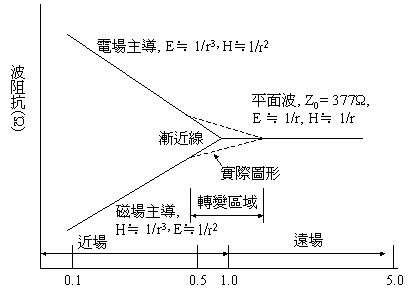 近場(near field)(磁和電的成份)和遠(yuǎn)場的關(guān)系,如附圖一所示。所有的波都是磁場和電場成份的組合。這種組合稱作「Poynting向量」。實(shí)際上,是沒有一個(gè)單獨(dú)的電波或磁波存在的。我們之所以能夠測量到平面波,是因?yàn)閷σ粋€(gè)小天線而言,在距離來源端數(shù)個(gè)波長的地方,其波前(wavefront)看起來像平面一樣。
