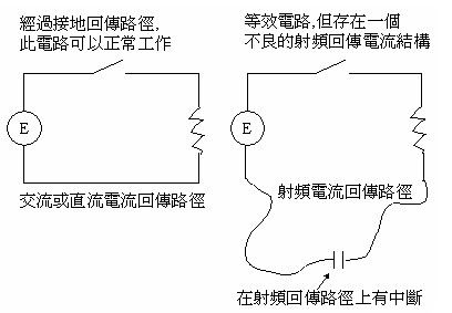 如附圖六所示,一個(gè)開關(guān)和來源驅(qū)動端(E)串聯(lián)。當(dāng)開關(guān)關(guān)閉時(shí),電路按照期望結(jié)果正常工作;當(dāng)開關(guān)開啟時(shí),則不具任何功能。對時(shí)域而言,期望訊號從來源端到達(dá)負(fù)載。此訊號必須具有一個(gè)回傳路徑,才能使此電路成立,這通常是經(jīng)過一個(gè)0V(接地)的回傳結(jié)構(gòu)(Kirchhoff定律)。射頻電流的流動是從來源端到達(dá)負(fù)載,而且必須經(jīng)過阻抗盡可能最小的路徑返回,通常它是經(jīng)過一個(gè)接地走線或接地平面(鏡射平面)。射頻電流的存在,最好使用Ampere定律來說明。
