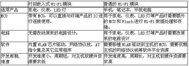 用于通訊產品的Wi-Fi模塊,因為終端產品,如手機,筆記本具有強大的CPU和Flash進行數據處理和存儲,因此在使用Wi-Fi時不需要額外的MCU。但是用于家電,儀表,LED燈等產品的Wi-Fi模塊,因為終端產品的MCU和Flash都無法支持Wi-Fi的功能,因此需要額外的MCU和Flash進行數據處理和存儲。為在這些產品上的應用提供方便,簡單的解決方案,村田開發(fā)了帶有MCU的Wi-Fi模塊-嵌入式Wi-Fi模塊。