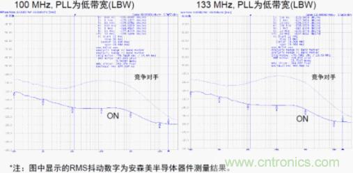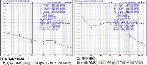 圖4:安森美半導(dǎo)體NB3N51034均方根抖動性能明顯優(yōu)于競爭器件