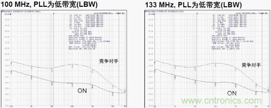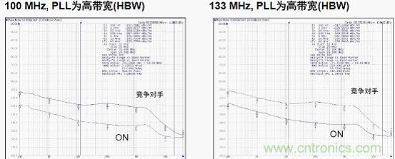 另外,多個PLL分層布置時,用戶可調(diào)節(jié)帶寬對時鐘樹進(jìn)行系統(tǒng)優(yōu)化。使用HBW(高帶寬)擴(kuò)頻時鐘時用于維持?jǐn)U頻特性,從而將輸入與輸出相位差減至最小;使用LBW (低帶寬)可濾除PLL帶寬內(nèi)的時鐘輸入抖動。