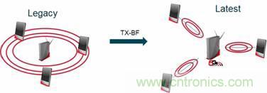 圖1. 借助 802.11ac(和802.11n)波束成形技術(shù),無論周邊有多少設(shè)備,集線器或AP都能讓無線信號直接傳向需要信號的設(shè)備。與此形成對比的是,傳統(tǒng)Wi-Fi技術(shù)只能在設(shè)定區(qū)域輻射無線信號,而該區(qū)域內(nèi)的任何設(shè)備都能接收該信號。