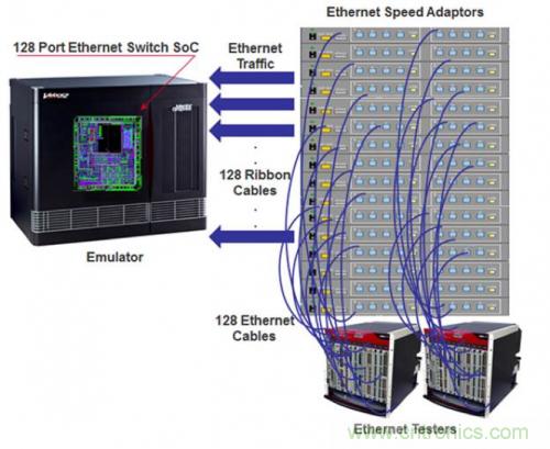 盡管可以在塊級別使用 HDL 軟件仿真時(shí),用仿真流量來驗(yàn)證數(shù)億門級的整個(gè)設(shè)計(jì)顯得不合實(shí)際,而且必然會被淘汰。這是一個(gè)在電路內(nèi)模擬 (In-Circuit-Emulation ICE) 模式中采用硬件模擬的主要案例。然而,ICE 配置需要對每個(gè)端口使用一個(gè)以太網(wǎng)測試儀。由于速度上的不匹配,測試儀和硬件仿真器不能直接連接,需要在兩者之間插入速率適配器。