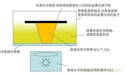 簡(jiǎn)單來說,立體光固化的過程就是光照射光敏樹脂表面,使其固化成薄薄的一層固體,已經(jīng)固化完成的部分被一塊基板黏附著,逐漸與光照射面拉開一定距離(通常是每次移動(dòng)十幾個(gè)微米),然后在上一層固化樹脂的基礎(chǔ)上再進(jìn)行下一層的照射和固化。經(jīng)過層層固化疊加之后,最終就形成一個(gè)完整的立體結(jié)構(gòu)。下面這張圖表示的就是SLA設(shè)備的基本結(jié)構(gòu),固化反應(yīng)發(fā)生在打印樹脂與透光玻璃板的交界面上,由于光照射面在液面的下方,打印的過程看上去就像從液體里“拉”出了打印制件一樣。