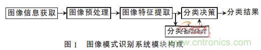 圖像識(shí)別技術(shù)是利用計(jì)算機(jī)視覺(jué)采集物理對(duì)象,以圖像數(shù)據(jù)為基礎(chǔ),讓機(jī)器模仿人類(lèi)視覺(jué),自動(dòng)完成某些信息的處理功能,達(dá)到人類(lèi)所具有的對(duì)視覺(jué)采集圖像進(jìn)行識(shí)別的能力,以代替人去完成圖像分類(lèi)及識(shí)別的任務(wù)。圖像模式識(shí)別系統(tǒng)通常由五個(gè)模塊組成,如圖1所示。