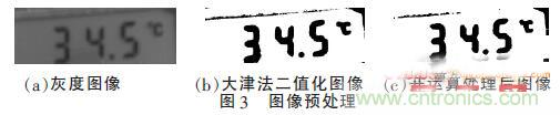 由上圖2所示,得到的圖像是彩色圖像,由于光照強(qiáng)度等原因,液晶屏圖像中常有許多噪聲點(diǎn)。為了得到精確圖像,本文對(duì)圖像進(jìn)行灰度化處理、大津法二值化處理和開(kāi)運(yùn)算處理。下圖3中(a)、(b)和(c)分別為灰度化處理、大津法二值化處理和開(kāi)運(yùn)算處理后的結(jié)果。