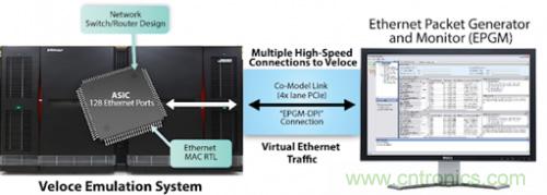 擁有成百上千個(gè)端口的設(shè)計(jì)需要與硬件擁有非常多的連接,而這些連接全都需要接線纜,這就使得在 ICE 環(huán)境中驗(yàn)證網(wǎng)絡(luò)交換機(jī)和路由器設(shè)計(jì)不再可行。此外,一個(gè)128 端口的以太網(wǎng)設(shè)計(jì)等可能具有數(shù)億甚至數(shù)十億個(gè)門的尺寸。
