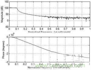 根據(jù)上面的程序,取調(diào)頻斜率為400,頻率控制字為10,幅度量化為10位(和所使用的D/A配合),相位累加器為24位,用Matlab仿真得到的線性調(diào)頻信號的波形和相應(yīng)的幅頻響應(yīng)如圖3和圖4所示。