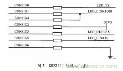 88E1111與C6678的MDIO模塊相連接,MDIO最多可識(shí)別32個(gè)物理芯片,在使用物理芯片之前需要對(duì)其進(jìn)行配置,配置內(nèi)容主要包括芯片的地址、模式等。配置CONFTG[6:0]管腳定義可查詢文獻(xiàn),本文配置的硬件電路如圖5所示,圖5中可以不使用電阻,本文為了測(cè)試方便,加一個(gè)0 Ω的電阻。