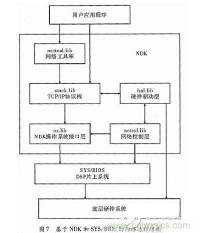 TI針對(duì)網(wǎng)絡(luò)開發(fā)發(fā)布了網(wǎng)絡(luò)開發(fā)套件(Network Development Kit,NDK),能將多個(gè)模塊的配置操作交給NDK網(wǎng)絡(luò)框架實(shí)現(xiàn),同時(shí)數(shù)據(jù)分包和解析也無需程序員過多考慮,加速了網(wǎng)絡(luò)開發(fā)進(jìn)程。NDK構(gòu)建在實(shí)時(shí)操作系統(tǒng)SYS/BIOS之上,NDK通過OS抽象層與BIOS進(jìn)行交互,同時(shí)BIOS的cfg配置文件能對(duì)NDK各模塊進(jìn)行可視化查看。