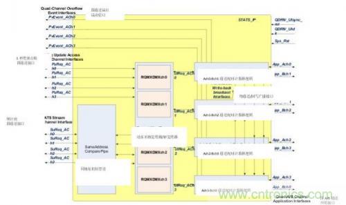 圖2中的STATS_IP架構(gòu)模塊圖標(biāo)出了三個(gè)子部件:每條通道的同地址比較管道(SACOMP)區(qū)塊、請求-復(fù)用-解復(fù)用(REQ_MXDMX_CHn)區(qū)塊以及每條QDR IV應(yīng)用通道1個(gè)的4個(gè)A-B通道配對計(jì)數(shù)器邏輯(ABCH_CTRL_CHn)區(qū)塊實(shí)例。