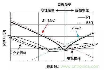 低頻率范圍:低頻率范圍的|Z|與理想電容器相同,都與頻率呈反比趨勢減少。ESR值也顯示出與電介質(zhì)分極延遲產(chǎn)生的介質(zhì)損耗相應(yīng)的特性。
