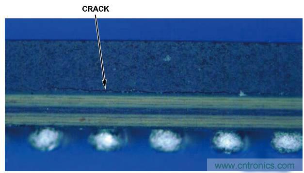 圖3. 過(guò)度加熱導(dǎo)致PBGA上出現(xiàn)裂紋的低放大率圖像(側(cè)視圖)