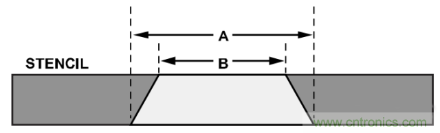 可利用模板來(lái)將焊膏涂敷到PCB焊盤(pán)上。模板對(duì)齊精度是使回流焊錫處理保持均勻的關(guān)鍵。使用與電路板裝配相同的PBGA孔徑幾何圖形和模板厚度。使用梯形孔徑(參見(jiàn)圖7)以確保焊膏均勻釋放并減少污點(diǎn)。