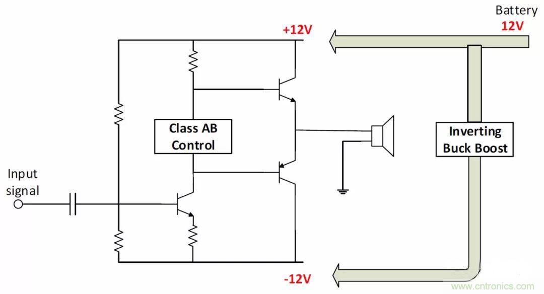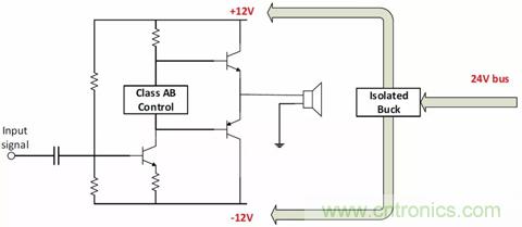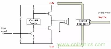 為這類應(yīng)用選擇合適的拓?fù)鋾r(shí),需要考慮輸入電壓。例如,為以±12V軌運(yùn)行的音頻放大器供電,如果輸入電源軌是24V,就選擇隔離式降壓拓?fù)?。如果使?2V電池,就可以用反相降壓-升壓拓?fù)洌陨韶?fù)壓軌。如果使用5V USB、12V電池或綠色能源供電的系統(tǒng),就應(yīng)該采用隔離式降壓-升壓拓?fù)?。圖12說明了如何用各種拓?fù)浣o音頻放大器供電。