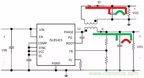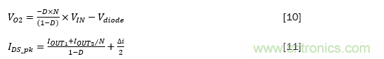 其中VIN是輸入電壓,VO2是次級(jí)輸出電壓,Vdiode是二極管正向壓降,D是占空比,N是變壓器匝數(shù)比,Ids_pk是通過頂部開關(guān)的峰值電流,△i是主電感器紋波電流的三角部分,IOUT1和IOUT2分別是由VO1和VO2,生成的輸出電流。