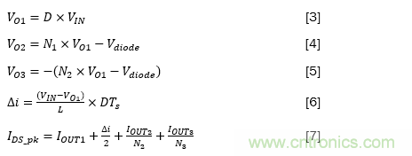 其中VO1是主輸出,VO2和VO3分別是正和負(fù)次級(jí)輸出,D是占空比,N1和N2分別是與VO2和VO3對(duì)應(yīng)的變壓器的匝數(shù)比。Vdiode是二極管的正向壓降,IOUT1、IOUT2和IOUT3分別是由VO1、VO2和VO3生成的輸出電流,Ids_pk是通過頂部開關(guān)的峰值電流,△i是主電感器紋波電流的三角部分。