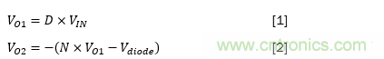 其中VIN是輸入電壓,VO1和VO2分別是主和次級(jí)輸出,D是占空比,N是變壓器匝數(shù)比,是二極管的正向壓降。