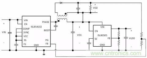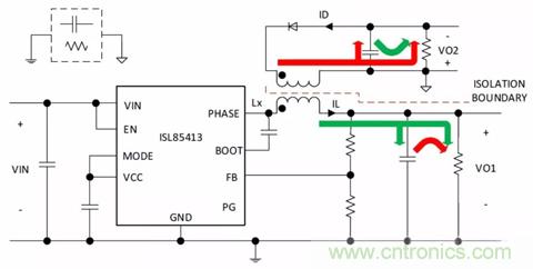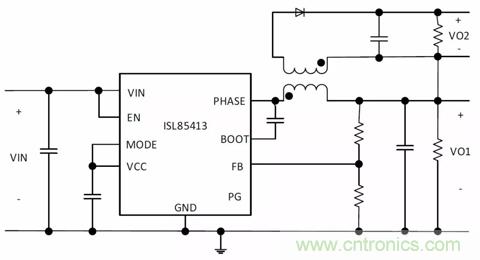 圖3.生成兩個(gè)+ VOUT軌的隔離式降壓拓?fù)洌↖SL85415DEMO2Z)