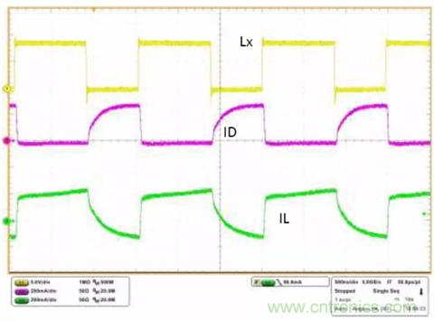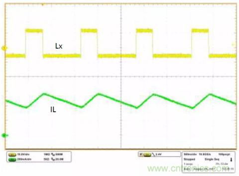 在高壓側(cè)開關(guān)接通的周期中(圖5中綠色箭頭指示電流),電感器電流斜坡上升,將能量?jī)?chǔ)存在電感器中,輸出電容器向負(fù)載提供電流。在低壓側(cè)開關(guān)接通的周期中(圖5中紅色箭頭指示電流),電感器電流斜坡下降,向負(fù)載提供電流,并為輸出電容器充電。ISL85415EVAL2Z反相降壓-升壓電路板的工作波形如圖6所示。