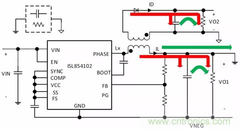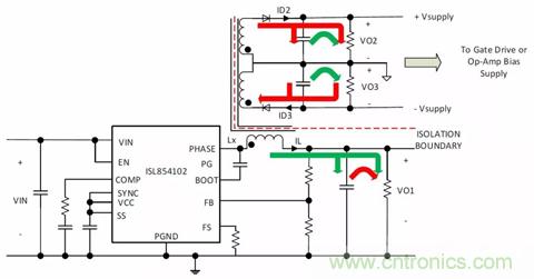 圖4. 生成3個(gè)輸出的隔離式降壓拓?fù)洌?個(gè)+VOUT和1個(gè)-VOUT軌(ISL854102DEMO2Z)