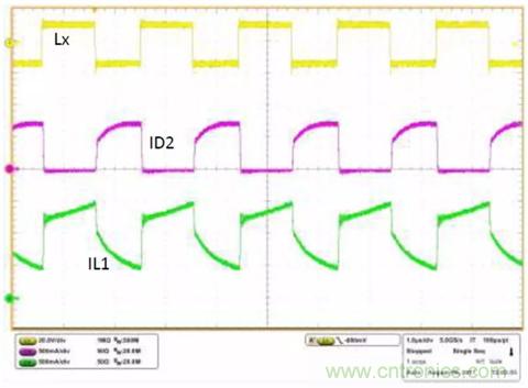 圖2. ISL85413DEMO3Z在VIN=9V、VO1=VO2=5V、IO1=IO2=100mA時(shí)的工作波形